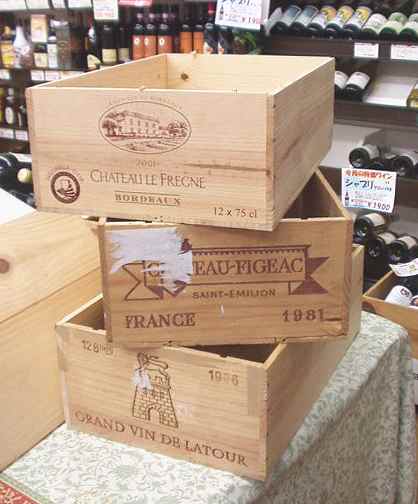 インテリアに道具入れとして大好評のワインの木箱 主にフランス・ボルドー地方の高級ワインが入っています。 高いワインは、そんなに要らないが木箱は、欲しいという ご要望に答えまして、キャンペーンをいたしますので ぜひ、ご利用ください! ・1本1000円以上の当店のワインを12本お買い上げの場合 ・12本以下でも合計12,000円以上お買い上げの場合 ・銘柄は、いくつかが混載になりましても結構です。 <ワインの木箱をプレゼント>させていただきます。 ★代引き料は、負担しますが送料はお願いいたします ★ぜひこの機会に、当店のワインをお買い求めください。 ★ご希望の銘柄・絵柄(例えば可愛いとか家の絵とか)があれば、 ご指定ください。無い場合は、当店で選ばさせて頂きます。 ★数量限定のため、なくなり次第キャンペーンを終了させて頂きます。 |